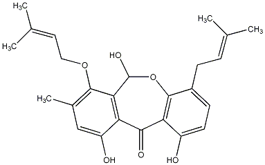 88.89 | C00033514 | 1,2-Dihydro-1,8,10-trihydroxy-2-(2-hydroxypropan-2-yl)-9-(3-methylbut-2-enyl)furo[3,2-a]-xanthen-11-one | ![]() |