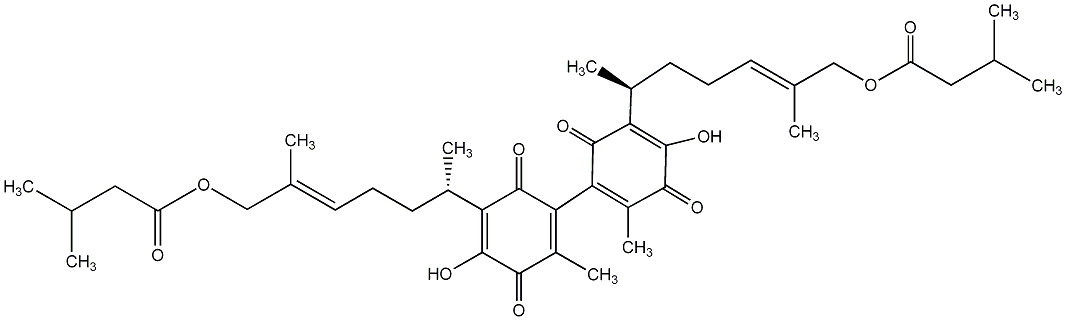 81.37 | C00011594 | [S-[R*,R*-(E,E)]]-(4,4'-Dihydroxy-2,2'-dimethyl-3,3',6,6'-tetraoxo[bi-1,4-cyclohexadien-1-yl]-5,5'-diyl)bis(2,6-dimethyl-2-hexene-6,1-diyl) ester 3-methyl-butanoic acid | ![]() |