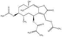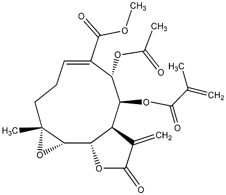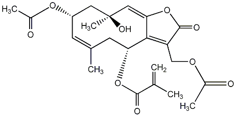 81.54 | C00012396 | (4R*,6Z,8R*,10S*,11E)-8-(Acetyloxy)-3-[(acetyloxy)methyl]-2,4,5,8,9,10-hexahydro-10-hydroxy-6,10-dimethyl-2-oxocyclodeca[b]furan-4-yl ester 2-methyl-2-propenoic acid | ![]() |