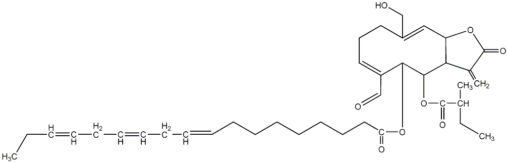 85.71 | C00012232 | 6-Formyl-2,3,3a,4,5,8,9,11a-octahydro-10-(hydroxymethyl)-3-methylene-4-(2-methyl-1-oxobutoxy)-2-oxocyclodeca[b]furan-5-yl ester 9,12,15-octadecatrienoic acid | ![]() |