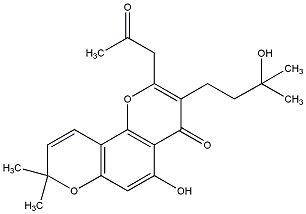 83.33 | C00004045 | Fulvinervin C (E)-5-Hydroxy-6-(3-hydroxy-3-methyl-1-butenyl)-8,8-dimethyl-2-phenyl-4H,8H-benzo[1,2-b:3,4-b']dipyran-4-one 5-Hydroxy-6-[(1E)-3-hydroxy-3-methyl-1-butenyl]-8,8-dimethyl-2-phenyl-4H,8H-benzo[1,2-b:3,4-b']dipyran-4-one |