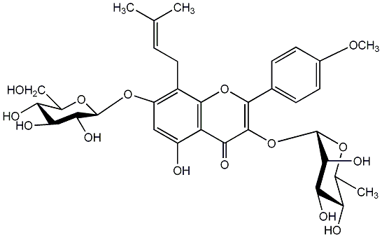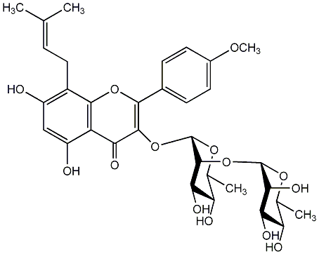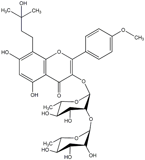 93.00 | C00014006 | Wanepimedoside A 8-(3''-Hydroxy-3''-methylbutyl)kaempferol 4'-methyl ether 3-rhamnosyl-(1->2)-rhamnoside 3-[[6-Deoxy-2-O-(6-deoxy-alpha-L-mannopyranosyl)-alpha-L-mannopyranosyl]oxy]-5,7-dihydroxy-8-(3-hydroxy-3-methylbutyl)-2-(4-methoxyphenyl)-4H-1-benzopyran-4-one |