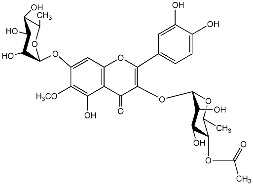 94.90 | C00006023 | Patuletin 3-rhamnoside-7-(2'''-acetylrhamnoside) Kalambroside B 7-[(2-O-Acetyl-6-deoxy-alpha-L-mannopyranosyl)oxy]-3-[(6-deoxy-alpha-L-mannopyranosyl)oxy]-2-(3,4-dihydroxyphenyl)-5-hydroxy-6-methoxy-4H-1-benzopyran-4-one |