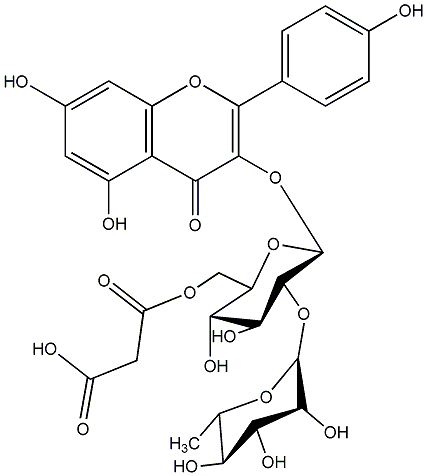 93.00 | C00013780 | Kaempferol 3-(6G-malonylneohesperidoside) 3-[[6-O-(Carboxyacetyl)-2-O-(6-deoxy-alpha-L-mannopyranosyl)-beta-D-glucopyranosyl]oxy]-5,7-dihydroxy-2-(4-hydroxyphenyl)-4H-1-benzopyran-4-one |
