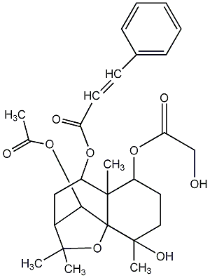 83.12 | C00013174 | Vaalens 5 [3R-[3alpha,5beta(E),5aalpha,6alpha,9beta,9aalpha,10R*]]-10-(Acetyloxy)octahydro-9-hydroxy-6-[(hydroxyacetyl)oxy]-2,2,5a,9-tetramethyl-2H-3,9a-methano-1-benzoxepin-5-yl ester 3-phenyl-2-propenoic acid |