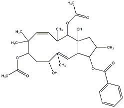 83.72 | C00013165 | [3R-(3alpha,5beta,5aalpha,6alpha,7alpha,9alpha,9aalpha,10R*)]-Octahydro-5a-(hydroxymethyl)-2,2,9-trimethyl-, 6,7,10-triacetate 5-benzoate 2H-3,9a-methano-1-benzoxepin-5,6,7,10-tetrol | ![]() |