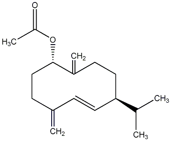 92.31 | C00011725 | [1S-(1R*,5E,7R*)]-4,10-bis(methylene)-7-(1-methylethyl)-5-Cyclodecen-1-ol acetate | ![]() |