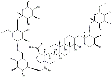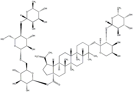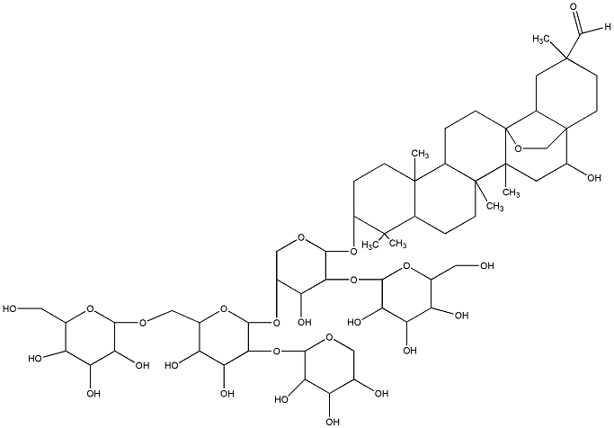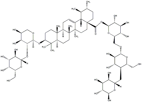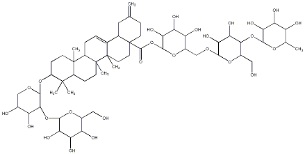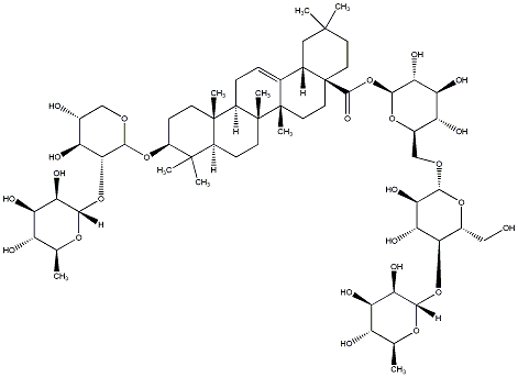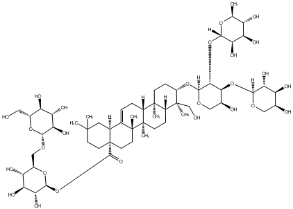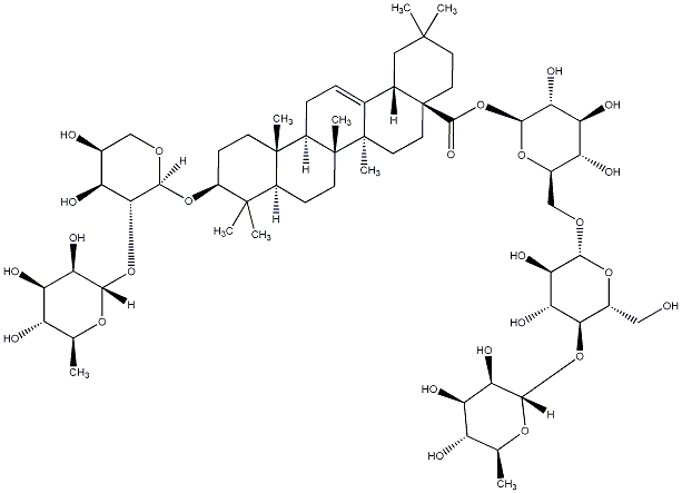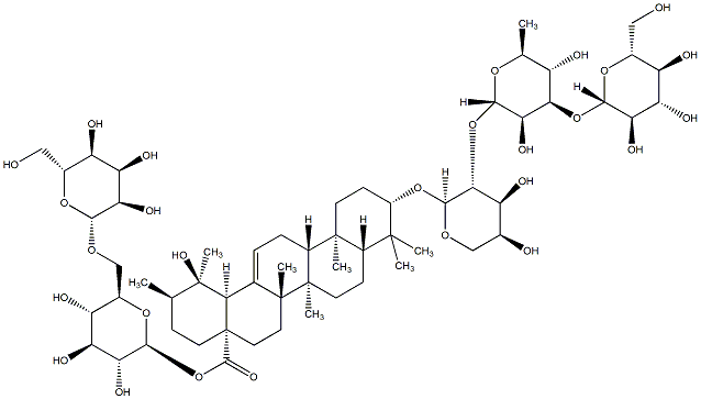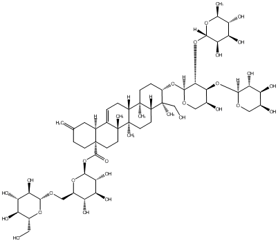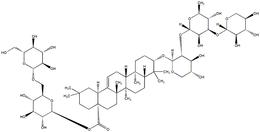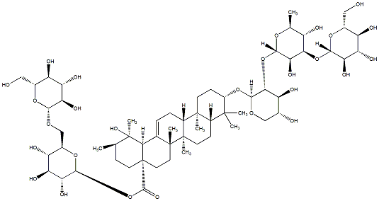 93.37 | C00019000 | (3beta,4alpha,22beta)-22-[[2-O-(6-Deoxy-alpha-L-mannopyranosyl)-alpha-L-arabinopyranosyl]oxy]-23-hydroxyolean-12-en-3-yl O-6-deoxy-alpha-L-mannopyranosyl-(1->2)-O-beta-D-galactopyranosyl-(1->2)-beta-D-glucopyranosiduronic acid | ![]() |