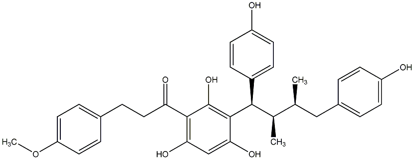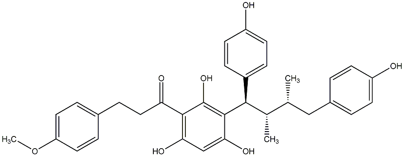 76.77 | C00014643 | Iryantherin G rel-1-[3-[(1R,2R,3S)-1,4-Bis(4-hydroxyphenyl)-2,3-dimethylbutyl]-2,4,6-trihydroxyphenyl]-3-(4-methoxyphenyl)-1-propanone |