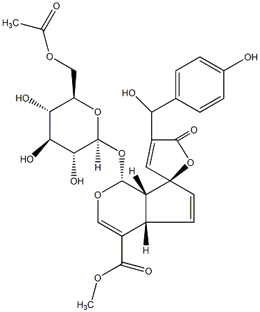90.70 | C00010689 | [1S-(1alpha,4aalpha,5alpha,7alpha,7aalpha]-7-(acetyloxy)-1-(beta-D-glucopyranosyl)-1,4a,5,6,7,7a-hexahydro-5-[(4-hydroxy-3,5-dimethoxybenzoyl)-7-methylcyclopenta[c]pyran-4-carboxylic acid methyl ester | ![]() |