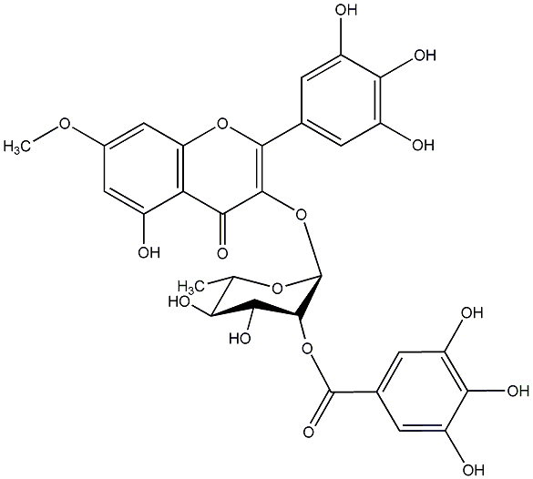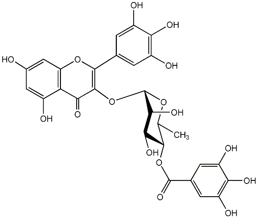 92.63 | C00013979 | Myricetin 3-(2''-galloylrhamnoside) 3-[[6-Deoxy-2-O-(3,4,5-trihydroxybenzoyl)-alpha-L-mannopyranosyl]oxy]-5-hydroxy-7-methoxy-2-(3,4,5-trihydroxyphenyl)-4H-1-benzopyran-4-one |
