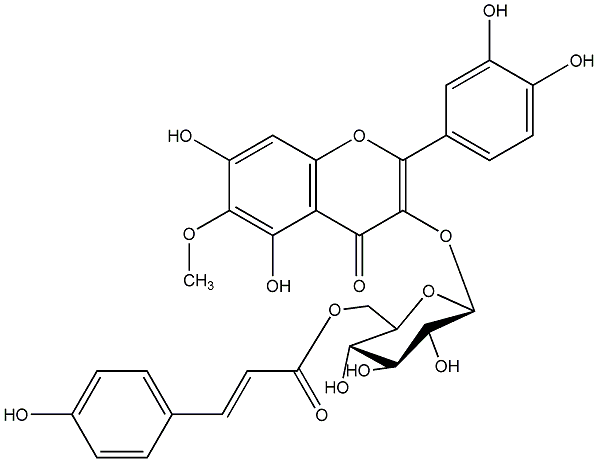 87.50 | C00013944 | Patuletin 3-(6''-p-coumaroylglucoside) Quercetagetin 6-methyl ether 3-(6''-p-coumaroylglucoside) 2-(3,4-Dihydroxyphenyl)-5,7-dihydroxy-3-[[6-O-[(2E)-3-(4-hydroxyphenyl)-1-oxo-2-propenyl]-beta-D-glucopyranosyl]oxy]-6-methoxy-4H-1-benzopyran-4-one |