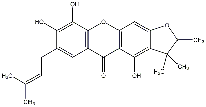 90.63 | C00033514 | 1,2-Dihydro-1,8,10-trihydroxy-2-(2-hydroxypropan-2-yl)-9-(3-methylbut-2-enyl)furo[3,2-a]-xanthen-11-one | ![]() |