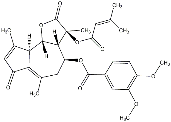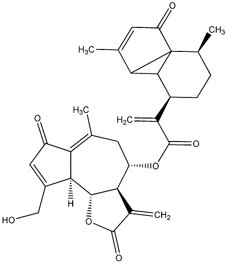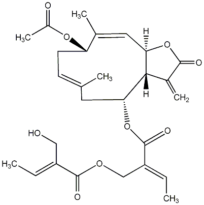 79.75 | C00011793 | [3aR-[3aR*,4R*[E(E)],6E,9R*,10Z,11aR*]]-2-[[[9-(Acetyloxy)-2,3,3a,4,5,8,9,11a-octahydro-6,10-dimethyl-3-methylene-2-oxocyclodeca[b]furan-4-yl]oxy]carbonyl]-2-butenyl ester 2-(hydroxymethyl)-2-butenoic acid | ![]() |
