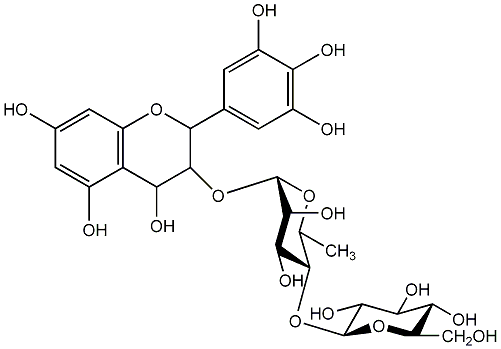 95.65 | C00005744 | Myricetin 3-galactoside-3'-rhamnoside 2-[3-[(6-Deoxy-alpha-L-mannopyranosyl)oxy]-4,5-dihydroxyphenyl]-3-(beta-D-galactopyranosyloxy)-5,7-dihydroxy-4H-1-benzopyran-4-one |