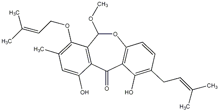 82.09 | C00023969 | Arugosin C 1,12a-Dihydro-6,8-dihydroxy-1-(1-hydroxy-1-methylethyl)-4-methyl-9-(3-methylbut-2-enyl[1]benzopyrano[4,5-bc][1]benzoxepin-7(2H)-one |
