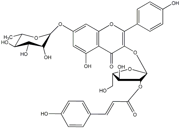 84.26 | C00013788 | Kaempferol 3-(2''-(E)-p-coumaroyl-alpha-L-arabinofuranoside)-7-rhamnoside 7-[(6-Deoxy-alpha-L-mannopyranosyl)oxy]-5-hydroxy-2-(4-hydroxyphenyl)-3-[[2-O-[(2E)-3-(4-hydroxyphenyl)-1-oxo-2-propenyl]-alpha-L-arabinofuranosyl]oxy]-4H-1-benzopyran-4-one |