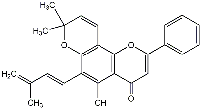 87.30 | C00004044 | Fulvinervin B (E)-5-Hydroxy-8,8-dimethyl-6-(3-methyl-1,3-butadienyl)-2-phenyl-4H,8H-benzo[1,2-b:3,4-b']dipyran-4-one 5-Hydroxy-8,8-dimethyl-6-[(1E)-3-methyl-1,3-butadienyl]-2-phenyl-4H,8H-benzo[1,2-b:3,4-b']dipyran-4-one |