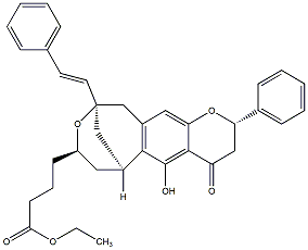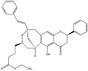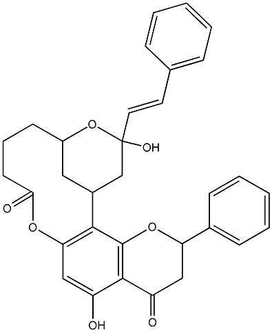 96.34 | C00014297 | Kurziflavolactone A (2R,12R,14R,16R)-rel-(-)-2,3,9,10,11,12,15,16-Octahydro-5,14-dihydroxy-2-phenyl-14-[(1E)-2-phenylethenyl]-12,16-methano-4H,8H,14H-pyrano[2,3-l][1,7]benzodioxacyclododecin-4,8-dione |
