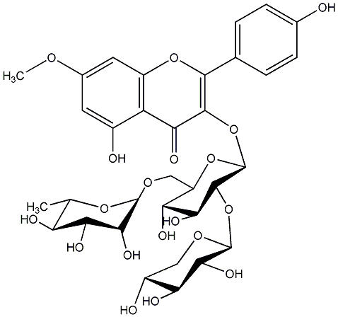 81.98 | C00013749 | Kaempferol 3-glucosyl-(1->4)-rhamnosyl-(1->2)-glucoside 3-[(O-beta-D-Glucopyranosyl-(1->4)-O-6-deoxy-alpha-L-mannopyranosyl-(1->2)-beta-D-glucopyranosyl)oxy]-5,7-dihydroxy-2-(4-hydroxyphenyl)-4H-1-benzopyran-4-one |