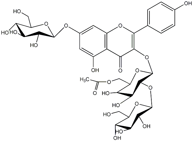 82.50 | C00013803 | Kaempferol 3-glucosyl-(1->2)-(6''-acetylgalactoside)-7-glucoside 3-[(6-O-Acetyl-2-O-beta-D-glucopyranosyl-beta-D-galactopyranosyl)oxy]-7-(beta-D-glucopyranosyloxy)-5-hydroxy-2-(4-hydroxyphenyl)-4H-1-benzopyran-4-one |