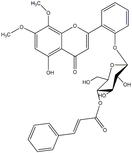 77.89 | C00013655 | Skullcapflavone I 2'-(4''-E-Cinnamoylglucoside) 5-Hydroxy-7,8-dimethoxy-2-[2-[[4-O-[(2E)-1-oxo-3-phenyl-2-propenyl]-beta-D-glucopyranosyl]oxy]phenyl]-4H-1-benzopyran-4-one |