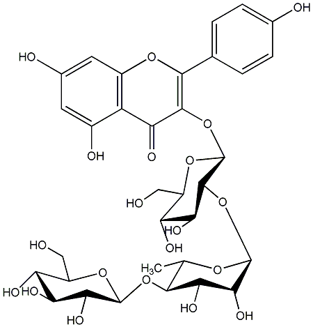 90.99 | C00013749 | Kaempferol 3-glucosyl-(1->4)-rhamnosyl-(1->2)-glucoside 3-[(O-beta-D-Glucopyranosyl-(1->4)-O-6-deoxy-alpha-L-mannopyranosyl-(1->2)-beta-D-glucopyranosyl)oxy]-5,7-dihydroxy-2-(4-hydroxyphenyl)-4H-1-benzopyran-4-one |