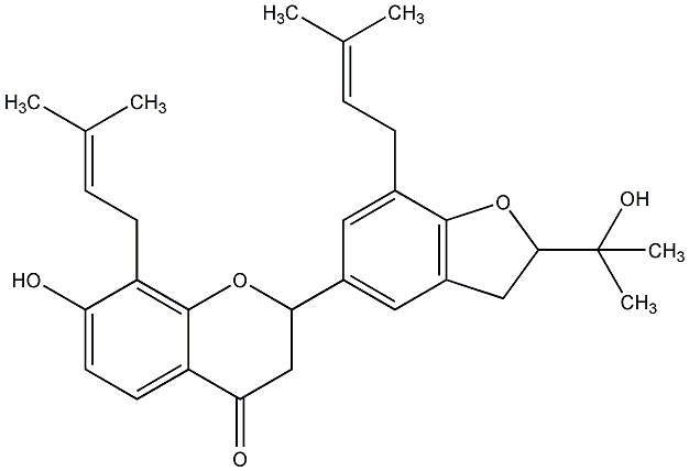 90.54 | C00020676 | 2-[2,3-Dihydro-2-(1-hydroxy-1-methylethyl)-7-(3-methyl-2-butenyl)-5-benzofuranyl]-2,3-dihydro-7-hydroxy-8-(3-methyl-2-butenyl)-4H-1-benzopyran-4-one | ![]() |