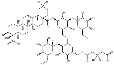 93.51 | C00019000 | (3beta,4alpha,22beta)-22-[[2-O-(6-Deoxy-alpha-L-mannopyranosyl)-alpha-L-arabinopyranosyl]oxy]-23-hydroxyolean-12-en-3-yl O-6-deoxy-alpha-L-mannopyranosyl-(1->2)-O-beta-D-galactopyranosyl-(1->2)-beta-D-glucopyranosiduronic acid | ![]() |