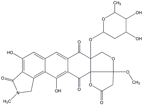InChI=1S/C28H27NO13/c1-10-21(33)15(31)6-17(40-10)42-26-9-39-27(38-3)7-16(32)41-28(26,27)24(36)20-12(23(26)35)4-11-5-14(30)19-13(18(11)22(20)34)8-29(2)25(19)37/h4-5,10,15,17,21,30-31,33-34H,6-9H2,1-3H3/t10-,15-,17+,21+,26+,27+,28+/m1/s1 |