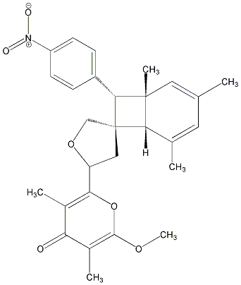 COc1oc(C2C[C@@]3(CO2)[C@H](c2ccc([N+](=O)[O-])cc2)[C@]2(C)C=C(C)C=C(C)[C@@H]23)c(C)c(=O)c1C |