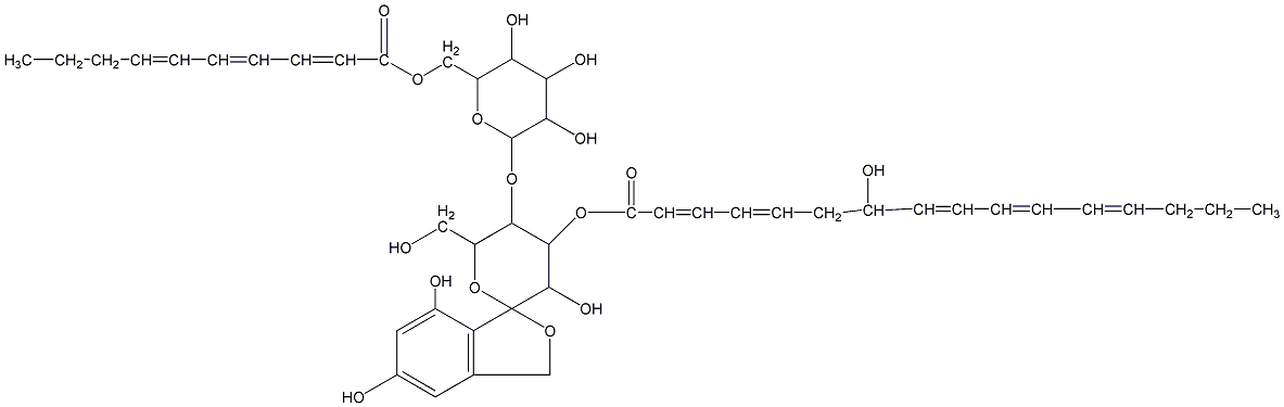 InChI=1S/C45H58O16/c1-3-5-7-9-11-13-16-20-30(47)21-17-15-19-23-36(51)59-42-41(33(26-46)61-45(43(42)55)37-29(27-57-45)24-31(48)25-32(37)49)60-44-40(54)39(53)38(52)34(58-44)28-56-35(50)22-18-14-12-10-8-6-4-2/h7-20,22-25,30,33-34,38-44,46-49,52-55H,3-6,21,26-28H2,1-2H3/b9-7+,10-8?,13-11-,14-12-,17-15-,20-16+,22-18+,23-19?/t30-,33?,34+,38+,39+,40+,41?,42?,43+,44-,45?/m1/s1 |