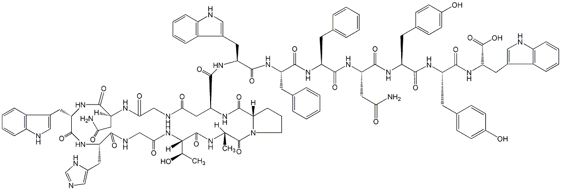InChI=1S/C103H115N23O23/c1-54-102(147)126-35-15-26-83(126)100(145)123-81(46-86(132)110-51-87(133)114-79(44-84(104)130)97(142)119-77(41-61-48-108-70-24-13-10-21-67(61)70)96(141)121-78(43-63-50-106-53-112-63)90(135)111-52-88(134)125-89(55(2)127)101(146)113-54)99(144)120-76(40-60-47-107-69-23-12-9-20-66(60)69)95(140)117-72(36-56-16-5-3-6-17-56)91(136)115-73(37-57-18-7-4-8-19-57)93(138)122-80(45-85(105)131)98(143)118-74(38-58-27-31-64(128)32-28-58)92(137)116-75(39-59-29-33-65(129)34-30-59)94(139)124-82(103(148)149)42-62-49-109-71-25-14-11-22-68(62)71/h3-14,16-25,27-34,47-50,53-55,72-83,89,107-109,127-129H,15,26,35-46,51-52H2,1-2H3,(H2,104,130)(H2,105,131)(H,106,112)(H,110,132)(H,111,135)(H,113,146)(H,114,133)(H,115,136)(H,116,137)(H,117,140)(H,118,143)(H,119,142)(H,120,144)(H,121,141)(H,122,138)(H,123,145)(H,124,139)(H,125,134)(H,148,149)/t54-,55+,72-,73-,74-,75-,76-,77-,78-,79-,80-,81-,82+,83-,89-/m0/s1 |