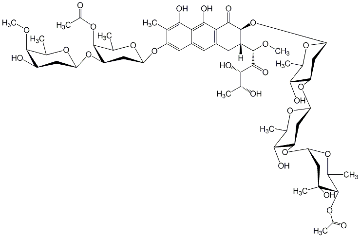 InChI=1S/C57H82O26/c1-21-34(79-40-19-37(53(26(6)75-40)77-28(8)59)82-38-16-33(61)52(70-11)25(5)74-38)15-31-13-30-14-32(54(71-12)51(68)46(63)22(2)58)55(50(67)44(30)49(66)43(31)45(21)62)83-41-18-35(47(64)24(4)73-41)80-39-17-36(48(65)23(3)72-39)81-42-20-57(10,69)56(27(7)76-42)78-29(9)60/h13,15,22-27,32-33,35-42,46-48,52-56,58,61-66,69H,14,16-20H2,1-12H3/t22-,23-,24-,25+,26+,27-,32-,33+,35-,36+,37+,38-,39+,40-,41+,42+,46+,47+,48+,52-,53-,54+,55+,56+,57+/m1/s1 |