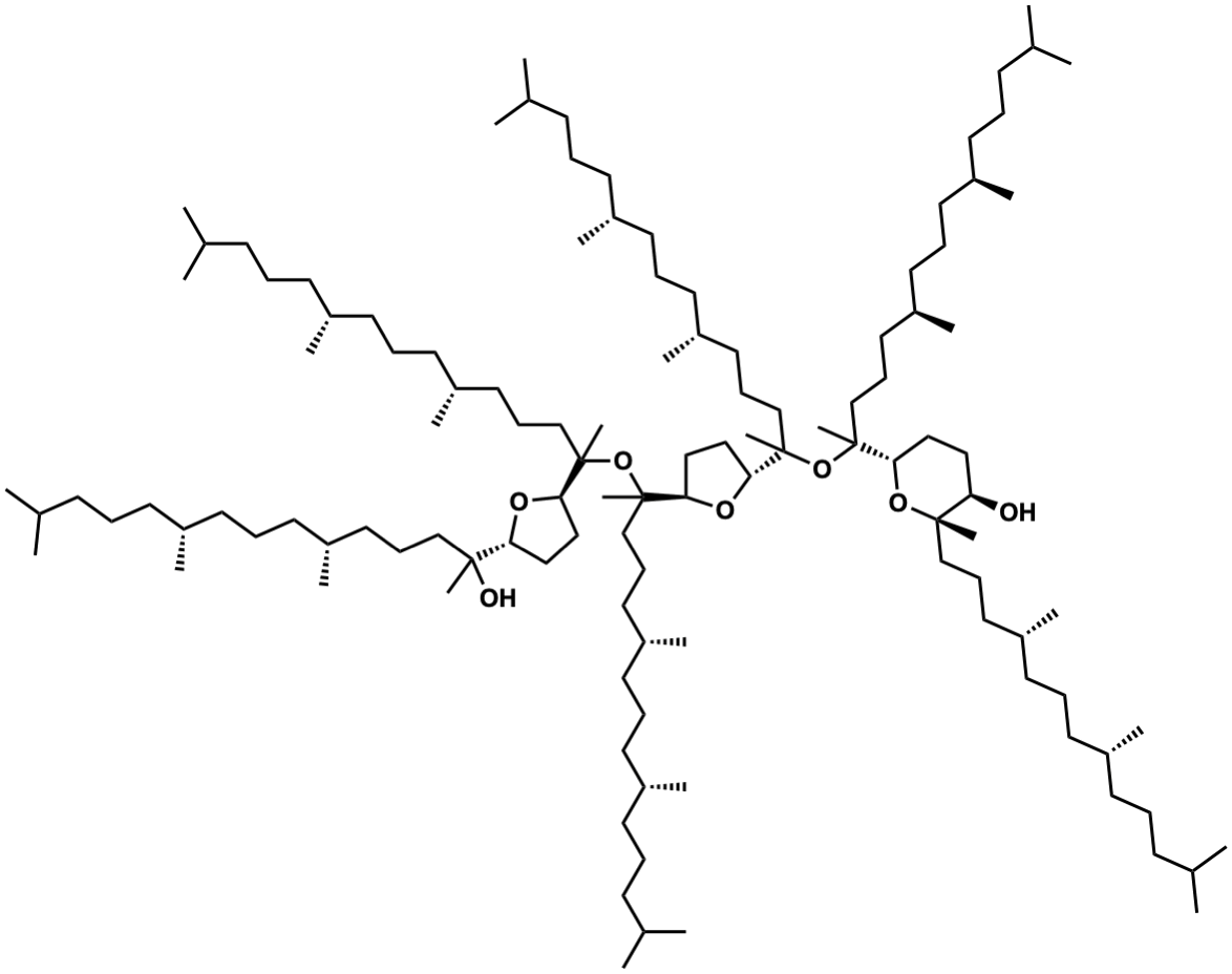 InChI=1S/C120H236O7/c1-91(2)49-31-55-97(13)61-37-67-103(19)73-43-85-115(25,122)110-81-82-111(123-110)117(27,87-45-75-105(21)69-39-63-99(15)57-33-51-93(5)6)126-118(28,88-46-76-106(22)70-40-64-100(16)58-34-52-94(7)8)112-83-84-113(124-112)119(29,89-47-77-107(23)71-41-65-101(17)59-35-53-95(9)10)127-120(30,90-48-78-108(24)72-42-66-102(18)60-36-54-96(11)12)114-80-79-109(121)116(26,125-114)86-44-74-104(20)68-38-62-98(14)56-32-50-92(3)4/h91-114,121-122H,31-90H2,1-30H3/t97-,98-,99-,100-,101-,102-,103-,104-,105-,106-,107-,108-,109-,110-,111-,112-,113-,114+,115?,116+,117?,118?,119?,120?/m1/s1 |