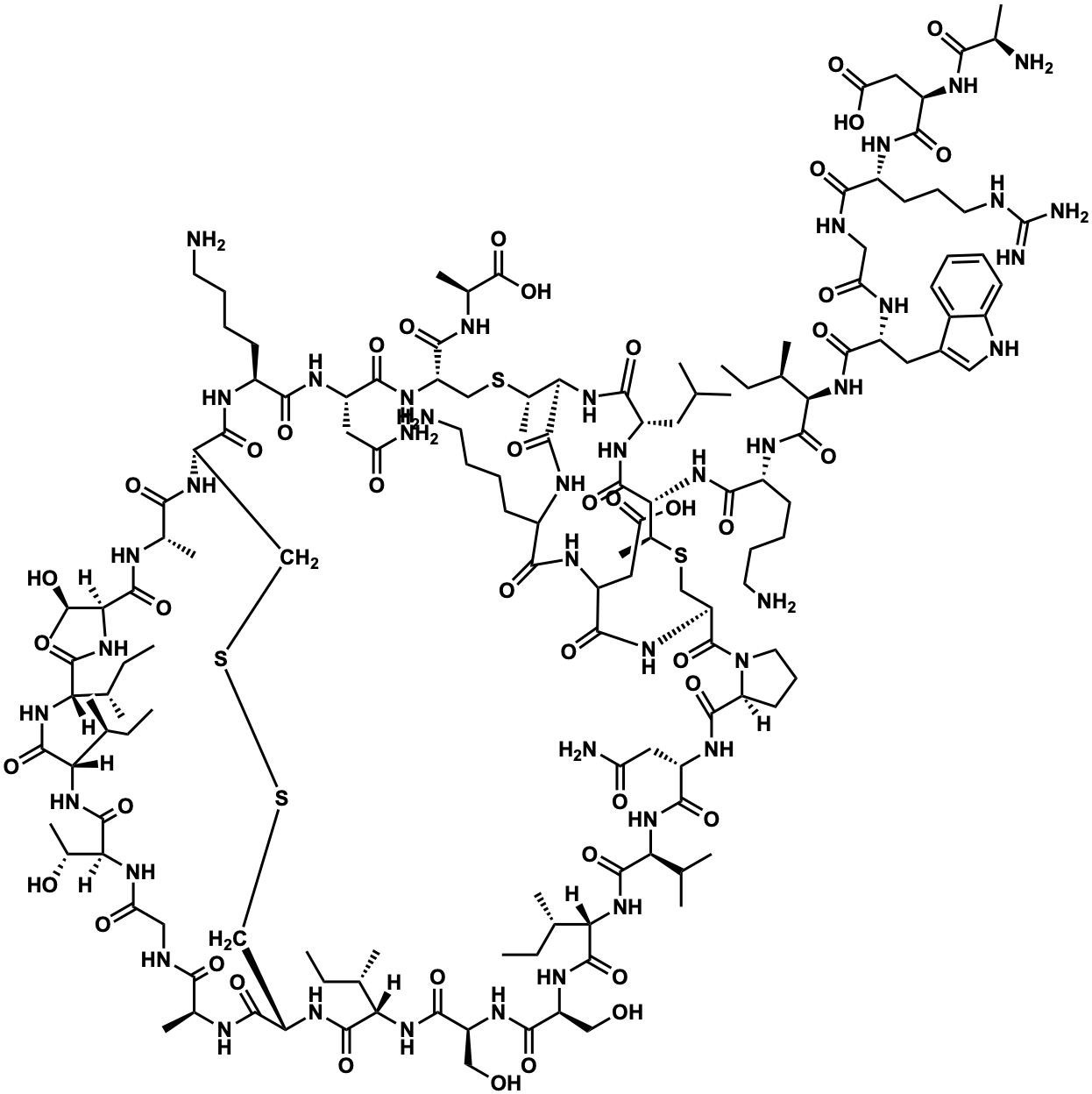 CC[C@@H](C)[C@@H](NC(=O)[C@@H](Cc1c[nH]c2ccccc12)NC(=O)CNC(=O)[C@@H](CCCNC(=N)N)NC(=O)[C@@H](CC(=O)O)NC(=O)[C@@H](C)N)C(=O)N[C@H](CCCCN)C(=O)N[C@H]1C(=O)N[C@@H](CC(C)C)C(=O)N[C@H]2C(=O)NC(CCCCN)C(=O)NC(CC(=O)O)C(=O)N[C@@H](CS[C@H]1C)C(=O)N1CCC[C@H]1C(=O)N[C@@H](CC(N)=O)C(=O)N[C@@H](C(C)C)C(=O)N[C@@H]([C@@H](C)CC)C(=O)N[C@@H](CO)C(=O)N[C@@H](CO)C(=O)N[C@@H]([C@@H](C)CC)C(=O)N[C@H]1CSSC[C@H](NC(=O)[C@H](C)NC(=O)[C@H]([C@@H](C)O)NC(=O)[C@H]([C@@H](C)CC)NC(=O)[C@H]([C@@H](C)CC)NC(=O)[C@H]([C@@H](C)O)NC(=O)CNC(=O)[C@H](C)NC1=O)C(=O)N[C@@H](CCCCN)C(=O)N[C@@H](CC(N)=O)C(=O)N[C@H](C(=O)N[C@@H](C)C(=O)O)CS[C@H]2C |