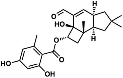 Cc1cc(O)cc(O)c1C(=O)O[C@H]1C[C@@]2(C)[C@@H]3CC(C)(C)C[C@@H]3C=C(C=O)[C@@]12O |
