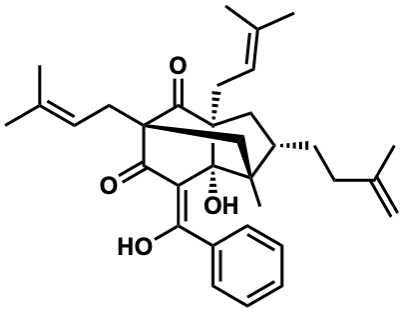InChI=1S/C33H42O4/c1-21(2)13-14-25-19-32(18-16-23(5)6)29(36)31(17-15-22(3)4)20-30(25,7)33(32,37)26(28(31)35)27(34)24-11-9-8-10-12-24/h8-12,15-16,25,34,37H,1,13-14,17-20H2,2-7H3/b27-26+/t25-,30+,31+,32+,33-/m0/s1 |