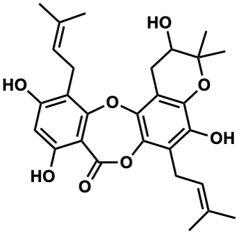 CC(C)=CCc1c(O)c2c(c3c1OC(=O)c1c(O)cc(O)c(CC=C(C)C)c1O3)CC(O)C(C)(C)O2 |