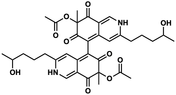 InChI=1S/C34H40N2O10/c1-17(37)9-7-11-21-13-23-25(15-35-21)29(41)33(5,45-19(3)39)31(43)27(23)28-24-14-22(12-8-10-18(2)38)36-16-26(24)30(42)34(6,32(28)44)46-20(4)40/h13-18,35-38H,7-12H2,1-6H3 |