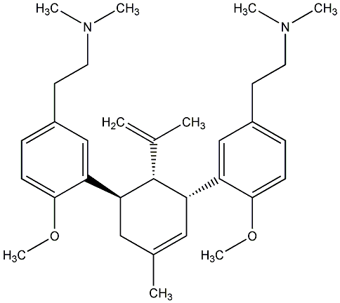 InChI=1S/C32H46N2O2/c1-22(2)32-28(26-20-24(14-16-33(4)5)10-12-30(26)35-8)18-23(3)19-29(32)27-21-25(15-17-34(6)7)11-13-31(27)36-9/h10-13,18,20-21,28-29,32H,1,14-17,19H2,2-9H3/t28-,29-,32+/m0/s1 |