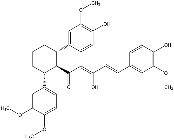 InChI=1S/C33H34O8/c1-38-29-15-11-22(18-32(29)41-4)25-7-5-6-24(21-10-14-27(36)31(17-21)40-3)33(25)28(37)19-23(34)12-8-20-9-13-26(35)30(16-20)39-2/h5,7-19,24-25,33-36H,6H2,1-4H3/b12-8+,23-19-/t24-,25+,33-/m1/s1 |