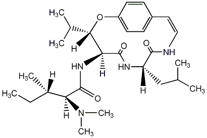 InChI=1S/C28H44N4O4/c1-9-19(6)24(32(7)8)28(35)31-23-25(18(4)5)36-21-12-10-20(11-13-21)14-15-29-26(33)22(16-17(2)3)30-27(23)34/h10-15,17-19,22-25H,9,16H2,1-8H3,(H,29,33)(H,30,34)(H,31,35)/b15-14-/t19-,22-,23-,24-,25-/m0/s1 |