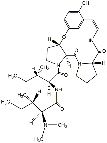 InChI=1S/C32H47N5O6/c1-7-19(3)26(34-30(40)27(35(5)6)20(4)8-2)31(41)37-17-14-25-28(37)32(42)36-16-9-10-23(36)29(39)33-15-13-21-18-22(43-25)11-12-24(21)38/h11-13,15,18-20,23,25-28,38H,7-10,14,16-17H2,1-6H3,(H,33,39)(H,34,40)/b15-13-/t19-,20-,23-,25-,26-,27-,28-/m0/s1 |