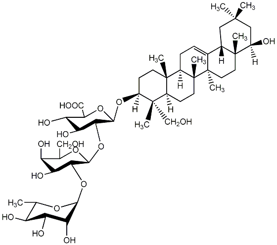 InChI=1S/C48H78O18/c1-21-29(52)31(54)35(58)40(61-21)65-37-32(55)30(53)24(19-49)62-41(37)66-38-34(57)33(56)36(39(59)60)64-42(38)63-28-12-13-45(5)25(46(28,6)20-50)11-14-48(8)26(45)10-9-22-23-17-43(2,3)18-27(51)44(23,4)15-16-47(22,48)7/h9,21,23-38,40-42,49-58H,10-20H2,1-8H3,(H,59,60)/t21-,23+,24-,25-,26-,27-,28+,29+,30+,31+,32+,33+,34+,35-,36+,37-,38+,40+,41+,42+,44-,45+,46+,47-,48-/m1/s1 |