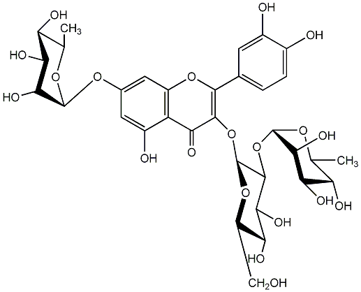 InChI=1S/C33H40O20/c1-9-19(38)23(42)26(45)31(47-9)49-12-6-15(37)18-16(7-12)50-28(11-3-4-13(35)14(36)5-11)29(22(18)41)52-33-30(25(44)21(40)17(8-34)51-33)53-32-27(46)24(43)20(39)10(2)48-32/h3-7,9-10,17,19-21,23-27,30-40,42-46H,8H2,1-2H3/t9-,10+,17+,19+,20+,21-,23+,24-,25+,26-,27+,30-,31+,32+,33+/m1/s1 |