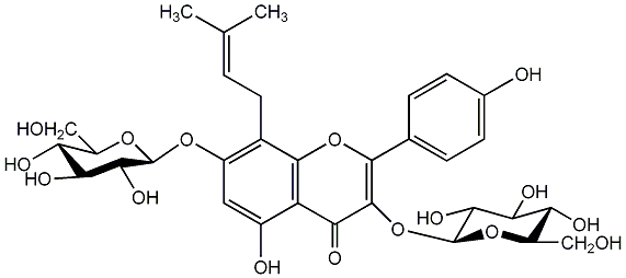 InChI=1S/C32H38O16/c1-12(2)3-8-15-17(44-31-26(42)24(40)21(37)18(10-33)45-31)9-16(36)20-23(39)30(28(47-29(15)20)13-4-6-14(35)7-5-13)48-32-27(43)25(41)22(38)19(11-34)46-32/h3-7,9,18-19,21-22,24-27,31-38,40-43H,8,10-11H2,1-2H3/t18-,19-,21+,22+,24+,25+,26-,27-,31-,32+/m1/s1 |