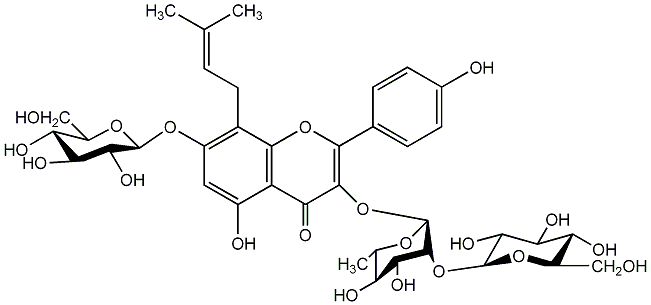 CC(C)=CCc1c(O[C@@H]2OC(CO)[C@@H](O)[C@H](O)C2O)cc(O)c2c(=O)c(O[C@@H]3OC(C)[C@H](O)[C@H](O)C3O[C@@H]3OC(CO)[C@@H](O)C(O)C3O)c(-c3ccc(O)cc3)oc12 |