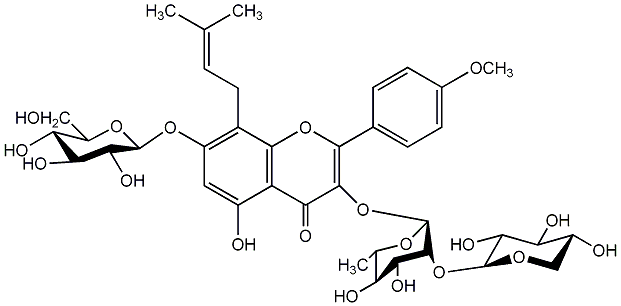 InChI=1S/C38H48O19/c1-14(2)5-10-18-21(53-37-31(49)28(46)26(44)22(12-39)54-37)11-19(40)23-27(45)34(32(55-33(18)23)16-6-8-17(50-4)9-7-16)56-38-35(29(47)24(42)15(3)52-38)57-36-30(48)25(43)20(41)13-51-36/h5-9,11,15,20,22,24-26,28-31,35-44,46-49H,10,12-13H2,1-4H3/t15-,20-,22-,24-,25-,26+,28-,29-,30-,31+,35-,36-,37+,38-/m0/s1 |