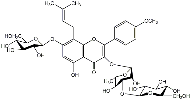 COc1ccc(-c2oc3c(CC=C(C)C)c(O[C@@H]4OC(CO)[C@@H](O)[C@H](O)C4O)cc(O)c3c(=O)c2O[C@@H]2OC(C)[C@H](O)[C@H](O[C@@H]3OC(CO)[C@@H](O)C(O)C3O)C2O)cc1 |